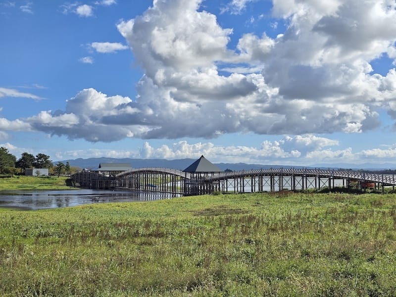 第三天一樣是06:30起床,08:00準時開車,跟團旅遊總是比上班還精實。 第一站車程42公里、63分鐘,抵達富士見湖公園,在這裡停留35分鐘。 鶴之舞橋由於橋墩皆為原木,每年秋冬都會進行年度維護,不開…