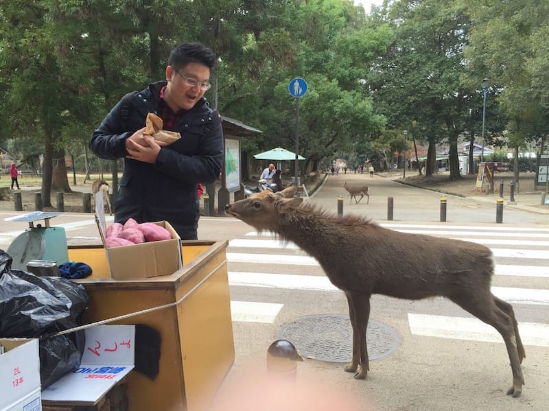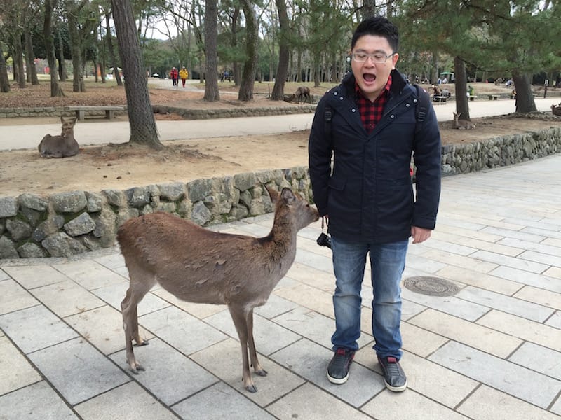 (上圖為鹿又舔了我的手,好濕QQ) 春日大社還能感受到一絲幽靜,東大寺前的遊客潮已經川流不息。 也因如此,我比較敢在東大寺前餵鹿,因為通常他們吃得比較飽,脾氣比較好。 不過今天…