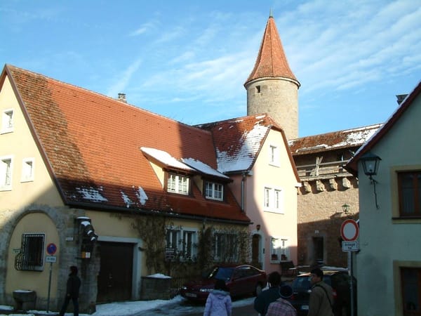 1/31 賓根->羅騰堡->哥廷根 免不了又是拉車的一天,在途中的休息站被眾人慫恿照下這張很丟臉的照片, 不過明顯的可以看出我和小金門的差距(????) 陶伯河上的羅騰堡(Rothenburg)位於羅曼…