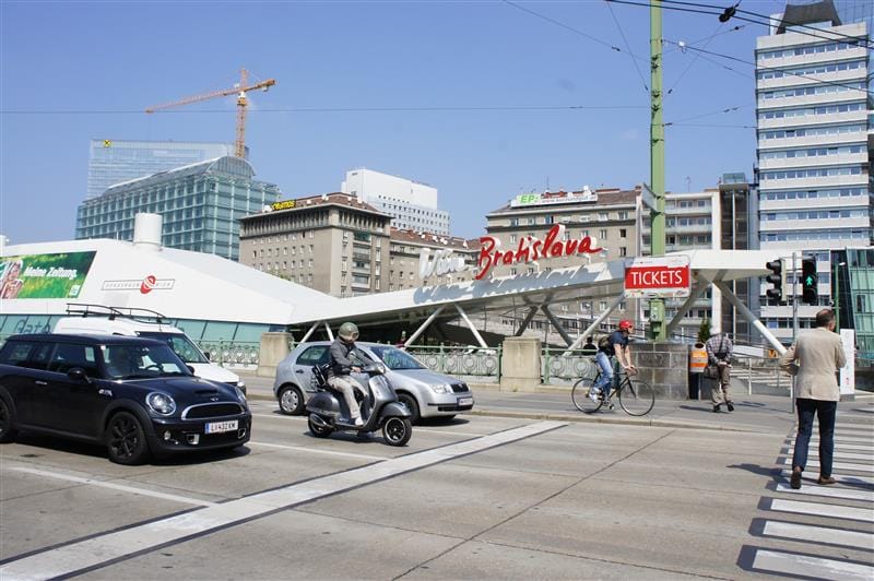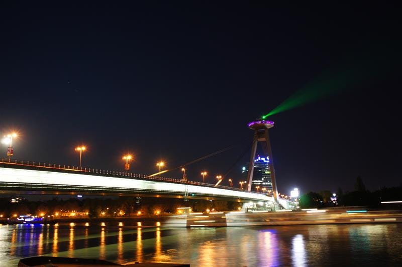 下船後前往飯店放行李,沿途許多長椅上都有台灣的國旗, 原來這裡的wifi是我們給的金援啊用起來真當之無愧。 我們的飯店就在Novy Most (or New Bridge or SNP Bridge)橋下, 這橋名字太多了,我…